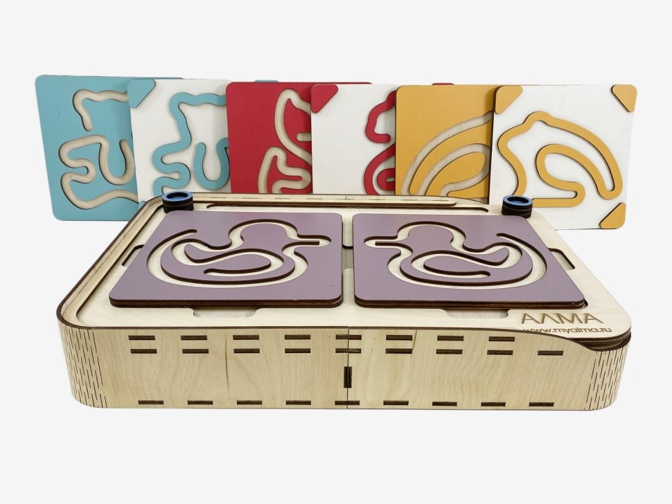 Это нейроигрушка для развития межполушарного взаимодействия. Состоит из коробки-основания и цветных лабиринтов-вкладышей. Два лабиринта с зеркально изображёнными картинками устанавливаются в пазы, и ребёнок проходит их с помощью специальных пальчиковых фишек.
