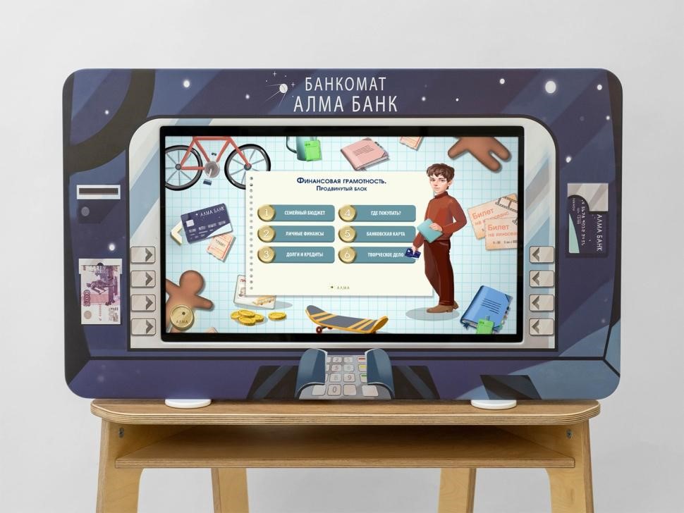 Интерактивный комплекс «АЛМА Банкомат» направлен на изучение финансовой грамотности детьми от 3х до 8 лет.