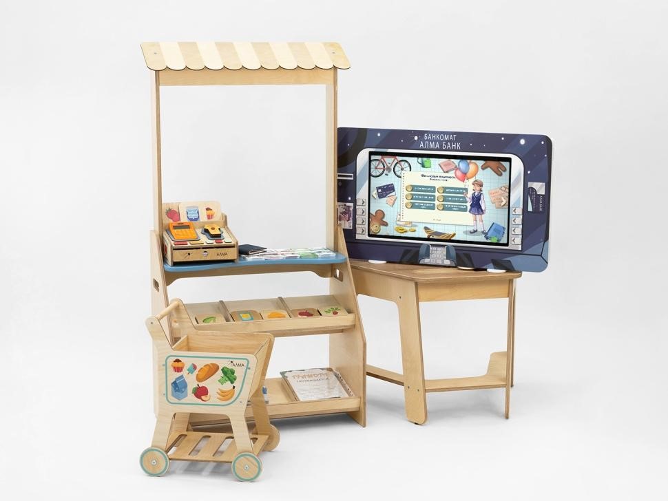 Дидактические игры: детский киоск АЛМА «Магазин» с кассой, тележкой и продуктами. Макеты денег и пластиковые карты, копилки, кошельки, наборы для групповых игр по усвоению навыков финансовой грамотности на практике.