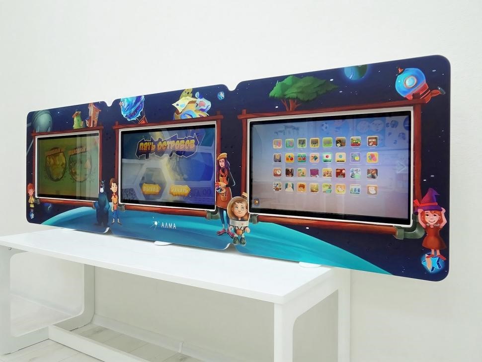 Корпус для трёх интерактивных панелей, украшенный детскими картинками и персонажами из программного обеспеченияИнтерактивная сенсорная панель 25 дюймов (Full HD, мультитач 10 касаний, характеристики встроенного компьютера уточняйте у менеджера), 3 шт.