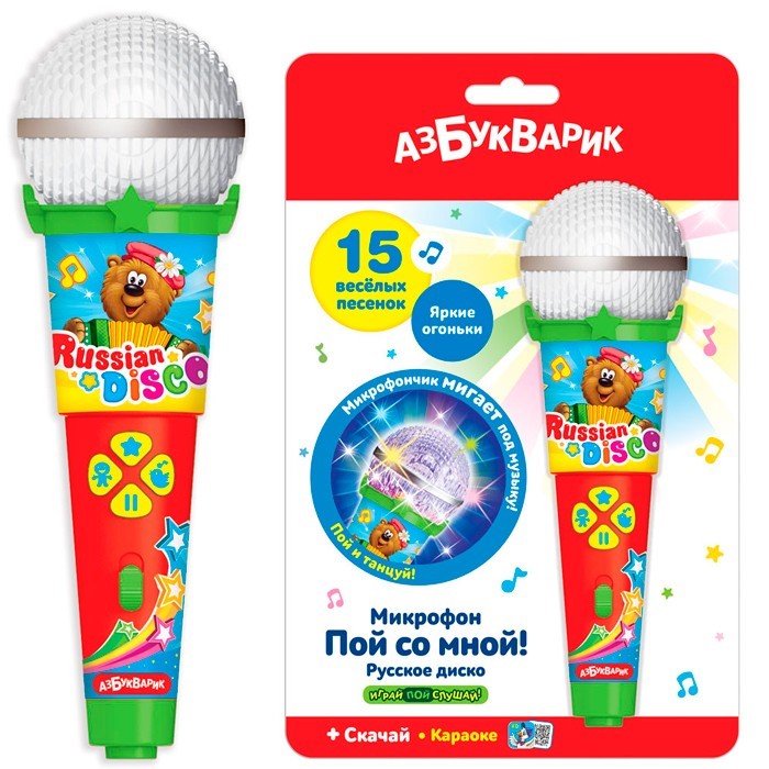 Этот удивительный микрофон превратит любой праздник в настоящее шоу! Он светится под музыку, как настоящий диско-шар! Слушай 15 детских хитов («Частушки Бабок-Ёжек», «Калинка», «Каравай», «Когда мои друзья со мной» и др.), танцуй и подпевай любимым героям. Весёлое пение с микрофоном раскроет музыкальные и актёрские таланты малыша.