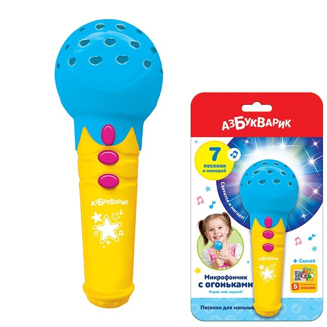 Оригинальный яркий микрофон предназначен для активных игр и развития мелкой моторики и координации движений. Яркая расцветка развлечет малыша и привлечет его внимание. Игрушка учит пониманию причинно-следственной связи, помогает тренировать моторику и координацию движений, восприятие формы и цвета. Музыкальный микрофон оборудован кнопками, нажимая на которые можно прослушать мелодии. Работает от батареек. Игрушка привлекает внимание и способствует развитию тактильного, зрительного и слухового восприятия малыша. Игрушки сделаны из прочного и безопасного материала.