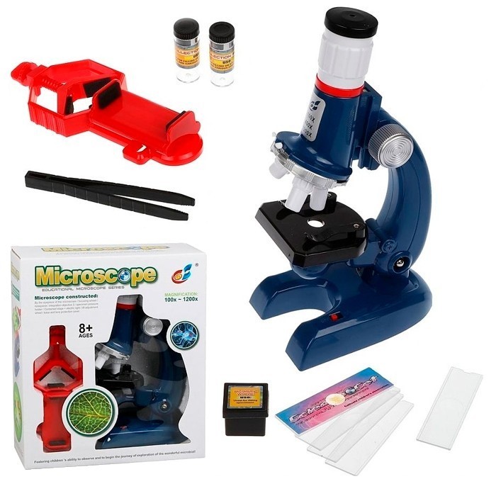 Набор для настоящего маленького иследователя - микроскоп с деражателем для телефона и аксессуарами. Микроскоп оснащен тремя увеличительными линзами: 100х, 400х и 1000х, подсветкой, а также различными аксессуарами которые могут понадобиться в учебном процесе. В наборе: предметные стекла, колбы для материалов, пластиковый контейнер, пинцет и даже держатель для телефона. Питание микроскопа - от 2 батареек типа АА (не входят в комплект).