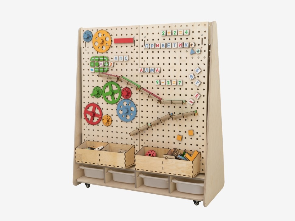Панель «АЛМА STEM» от компании «АЛМА» состоит из фирменных деревянных платформ оснований и цветных дидактических элементов для конструирования и моделирования. В процессе занятий их можно комбинировать, двигать и переставлять так, как требуется в исходной задаче.