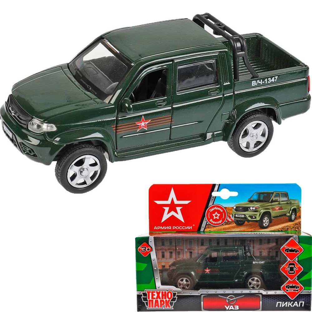 Металлическая модель «UAZ PICKUP (АРМИЯ РОССИИ)» от ТМ «Технопарк» понравится коллекционерам и юным автолюбителям.