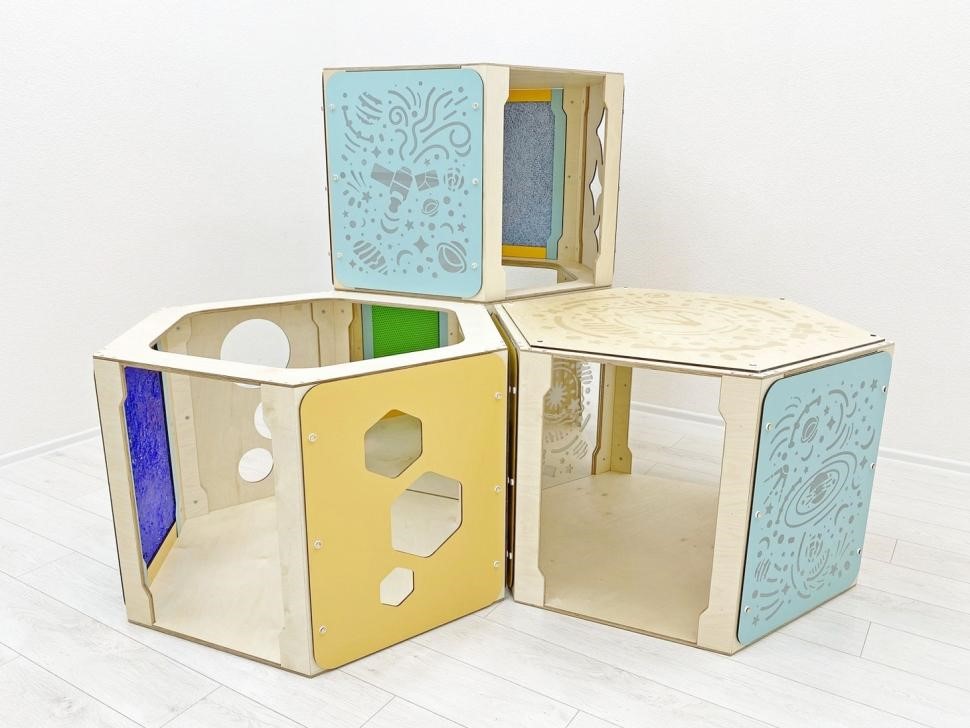 Внутри модули украшены тактильными панелями для развития сенсорной чувствительности, а снаружи – лазерной гравировкой и фигурными окошками. Они идеально стыкуются между собой и позволяют конструировать из них замки и лабиринты для маленьких непосед.