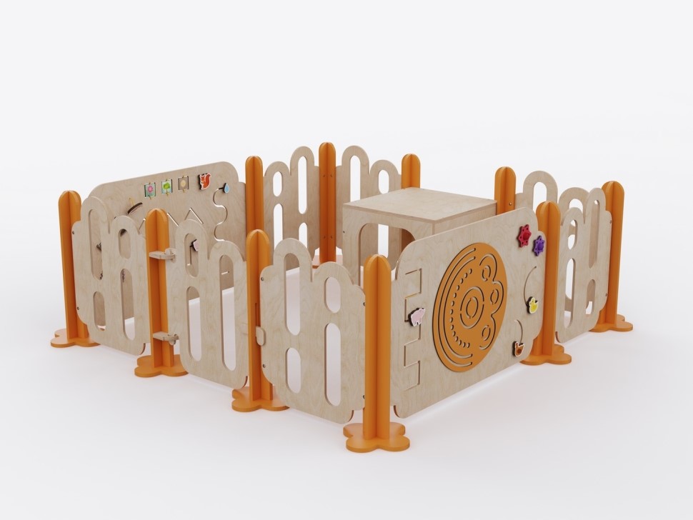 Манеж обеспечивает безопасность малышей, а дополнительные элементы конструкции — куб и бизиборды — расширяют игровое пространство и способствуют развитию координации, моторики и фантазии.