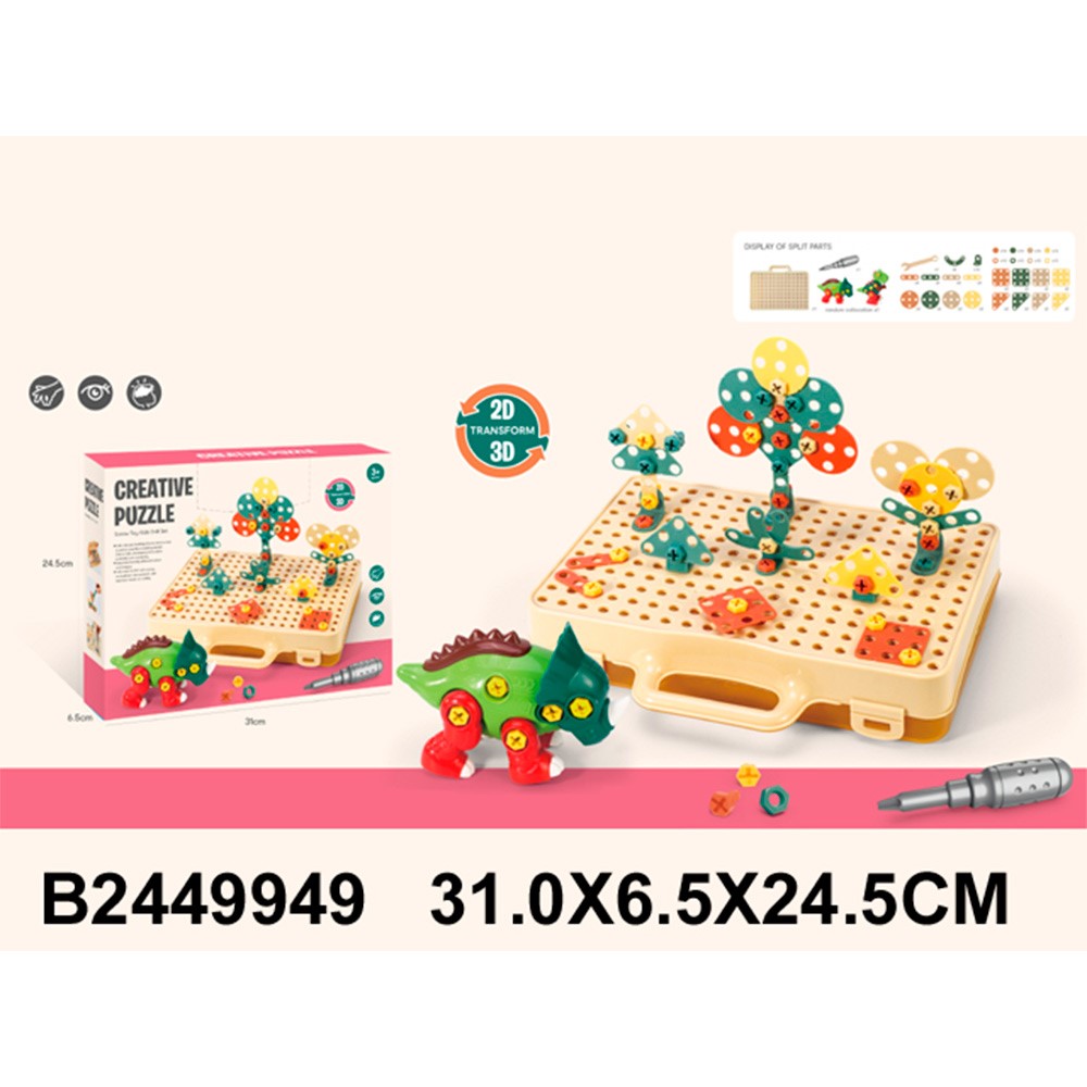 Комплектация: детали мозаики, игровое поле, отвертка, коробка с ячейками