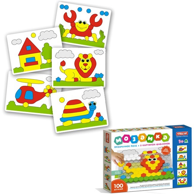 Мозаика для самых маленьких, состоящая из удобных крупных фишек, диаметром 4 см, прозрачной подложки-трафарета и картинок-образцов. Можно подложить картинку под прозрачное поле, и собрать домик, вертолетик, льва, крабика или черепашку, а можно придумывать картинки самому, включив воображение. Такая игра прекрасно развивает мелкую моторику малыша, усидчивость, способность доводить начатое до конца, а также логическое и образное мышление.