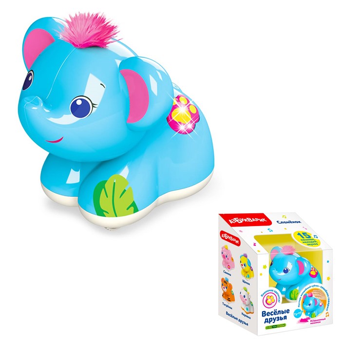 Забавный слоненок с пушистым чубчиком приведет малыша в восторг. А чубчик у него – волшебный! Нужно просто его погладить – и слоник заговорит! Нажимая на кнопочку, малыш послушает веселые песенки и мелодии («Слон», «Песенка про зоопарк», «Весёлые противоположности», «Полька», «Кукарача»). А если погладить чубчик во время звучания – слоненок будет подпевать. В игрушке также есть инерционный механизм – зверюшка ездит не хуже машинки.