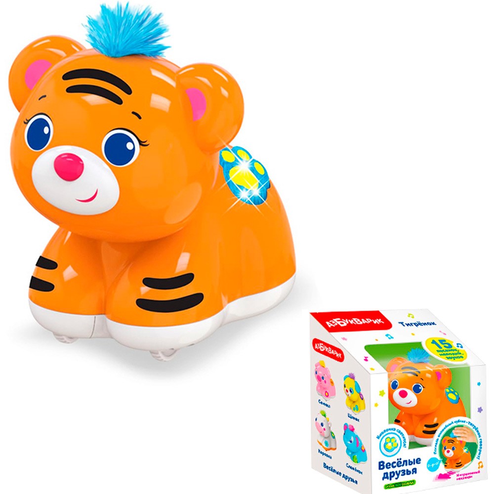 Милый тигренок с пушистым чубчиком приведет малыша в восторг. А чубчик у него – волшебный! Нужно просто его погладить – и тигренок заговорит! Нажимая на кнопочку, малыш послушает веселые песенки и мелодии («Озорной тигрёнок», «Приходи в зоопарк поскорей», «Чунга-чанга», «Арам зам зам», «Прятки»). А если погладить чубчик во время звучания – тигренок будет подпевать. В игрушке также есть инерционный механизм – зверюшка ездит не хуже машинки.