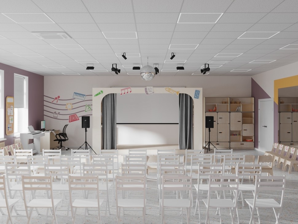 В комплектации готового музыкального зала есть техническое оснащение и базовый набор аксессуаров, костюмов и декораций для проведения тематических праздников и утренников. В зрительной части зала удобно размещается 25 воспитанников и 50 взрослых.