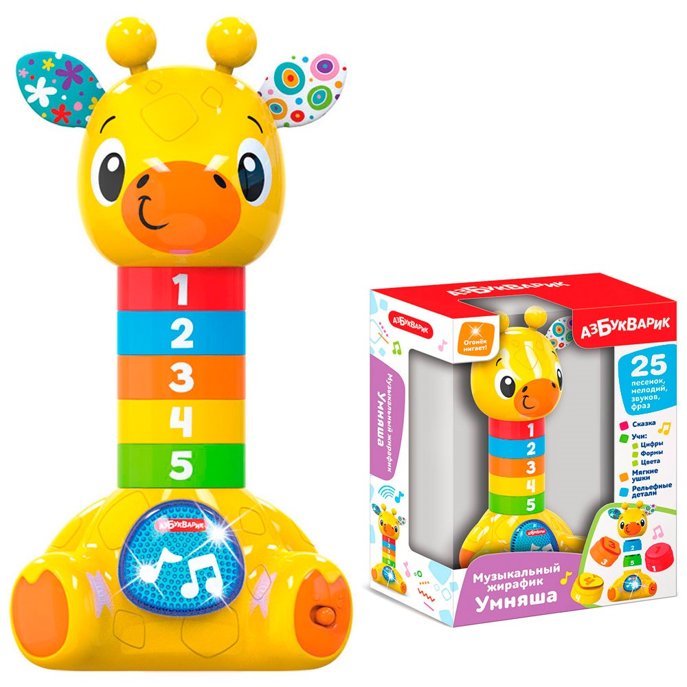 Нажимая на кнопочку с огоньком, ребенок послушает интересную сказку «Жирафик в цирке», 5 песенок («Как много игрушек на свете!», «Как хорошо уметь счита