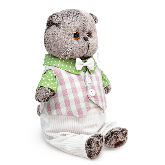 Мягкая игрушка «Басик в лёгком костюме» — обаятельный кот в весеннем наряде. Его образ с рубашкой в горошек, жилетом в клетку и белым бантом создан с вниманием к деталям. Басик выглядит нарядно и стильно, напоминая настоящего маленького джентльмена.