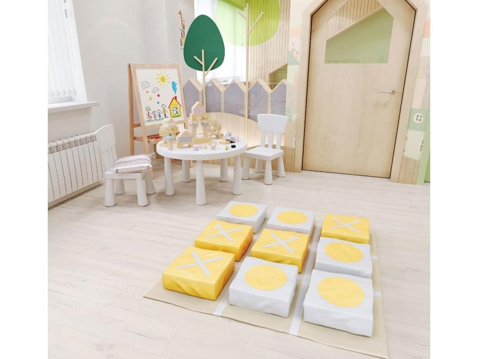 Развивающий мягкий модуль «Крестики-нолики» - представляет собой коврик прямоугольной формы для игр в крестики нолики. Кубики из поролона толщиной 10 см, обшитые винилискожей. Помогают развить логическое мышление. Состоит из коврика с прямоугольниками, поролоном. Яркие цвета учат детей познавать цвета и форму, взаимодействуя между собой в процессе игры. Помогают развить логическое мышление. Мягкие детали хорошо выдерживают нагрузку, не теряя при этом своей первоначальной формы, легко моются с помощью обычных моющих гигиенических средств. Не впитывают влагу и не имеют запаха, отличаются повышенными прочностными свойствами и долговечностью.