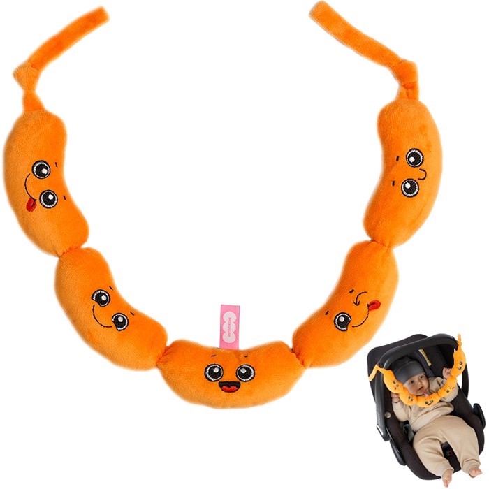 Подвес надежно крепится к автокресу и к кроватке новорожденного, позволяя малышу отвлечься за игрой, а родителям заняться своими делами. В каждом элементе игрушки находится звуковой элемент (пищалка, шуршалка и погремушка).