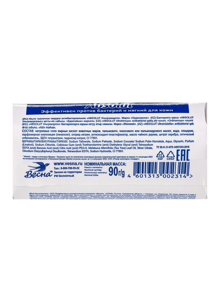 Мыло туалетное твердое Absolut Ультразащита обладает антибактериальным действием. Изготовлено из натурального сырья. Абсолютная защита от бактерий. Прекрасно очищает кожу, не вызывает раздражений, не сушит. Мыло туалетное Абсолют имеет приятный аромат, хорошо держит форму. Мыло абсолют антибактериальное подходит для частого использования. Удобно в использовании, имеет мягкую воздушную пенку. Не содержит Триклозан.
