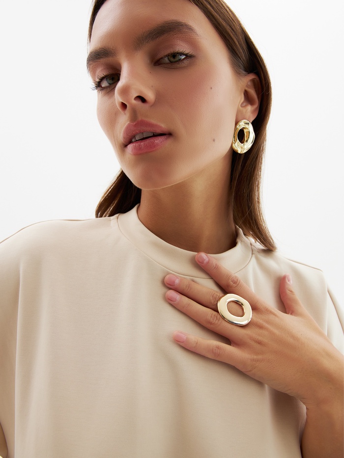 Этот стильный набор из двух предметов — серьги и кольцо «Мятый круг» — станет ярким акцентом в гардеробе современной женщины. Изготовленные в золотистом цвете, украшения привлекают внимание своей оригинальной текстурой и лаконичным дизайном, который легко сочетается с любыми образами — от деловых до повседневных.