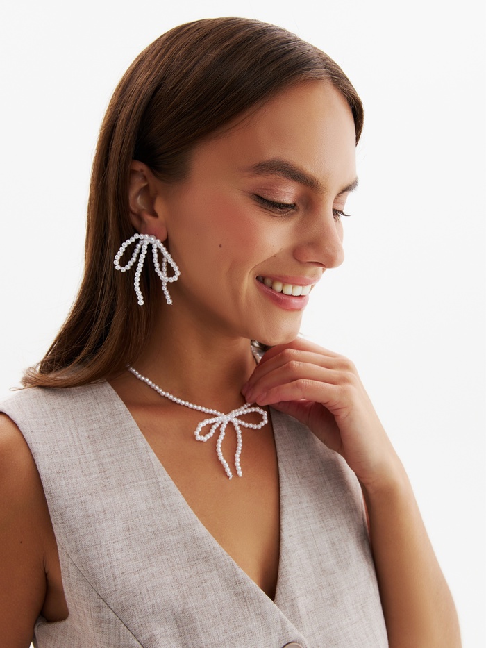 Набор 2 предмета: серьги, колье «Жемчуг» бантик, белый в серебре, 35 см
