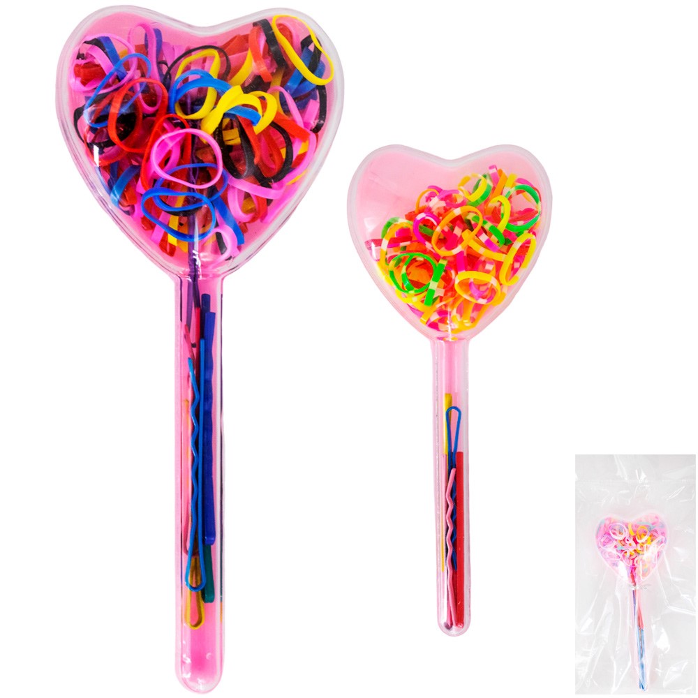 Набор разноцветных резиночек и невидимок подойдет для создания простых и сложных причесок. Для девочек и женщин. Также набор резинок подойдет для рукоделия, что развивает моторику рук. В комплекте идет кейс необычной формы-сердечко на палочке.