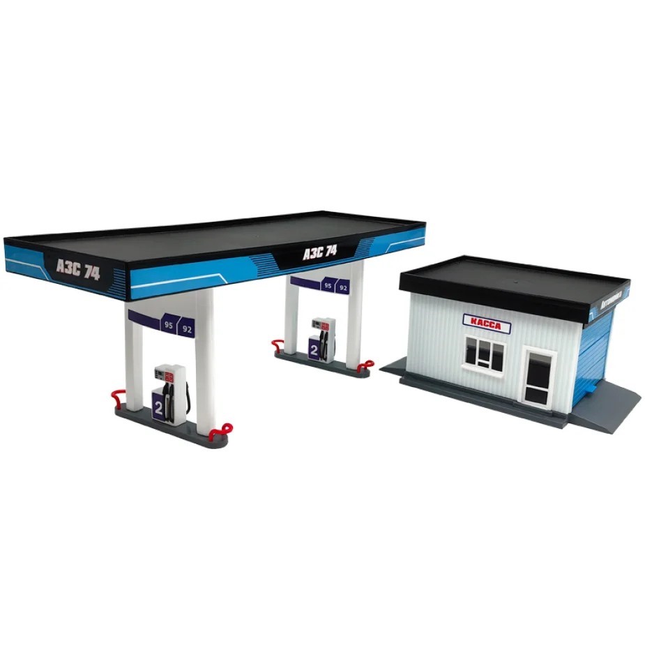 Набор позволяет собрать автозаправочную станцию. Подходит для игры масштабными машинками (от 1/43 до 1/36).