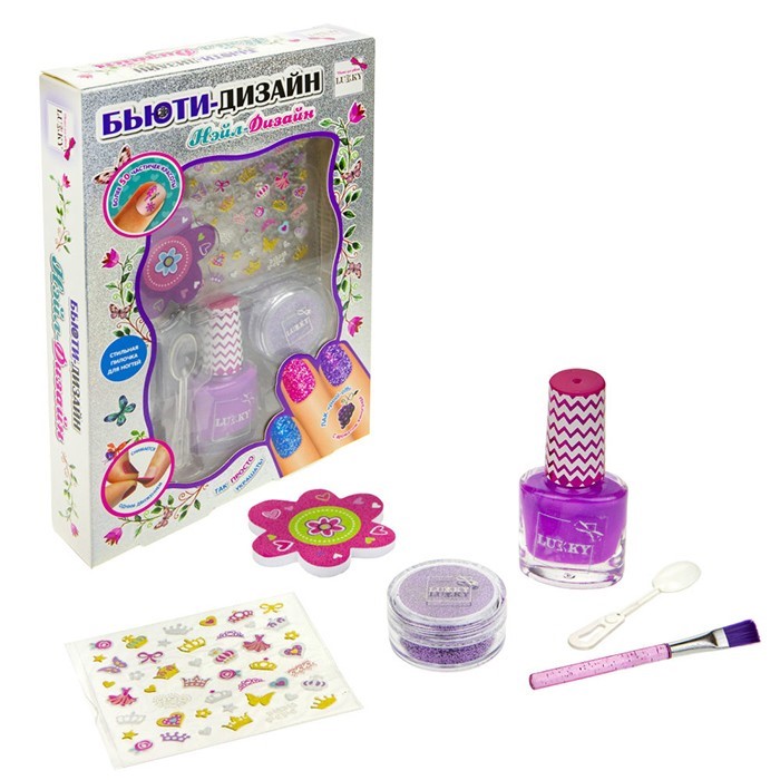 Комплектация: лак для ногтей, блестки, кисточка, пилочка, лопаточка, набор наклеек