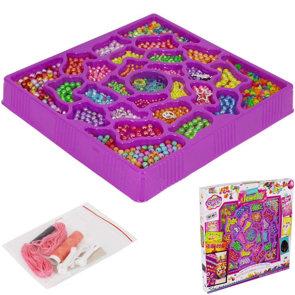 Комплект набора содержит множество ярких красочных бусин, из которых девочки смогут изготовить различные украшения: ожерелья, браслеты, бусы. Бусины и дополнительные материалы удобно хранить в коробке с отсеками.