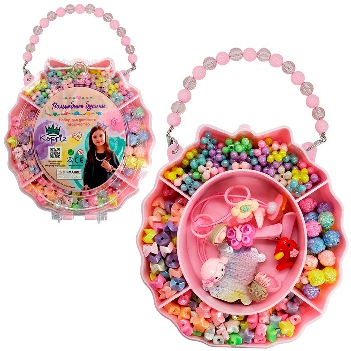 Комплектация: бусины, эластичная нить, резинки, заколки в виде зажимов, колечки.