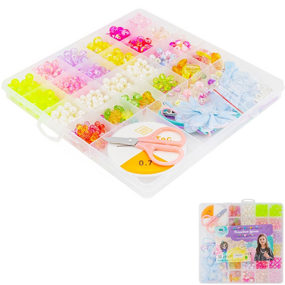 Комплектация: бусины разных форм и цветов, резинки, эластичная нить, застежки. Также в наборе есть сюрприз - заколки в форме цветочков.