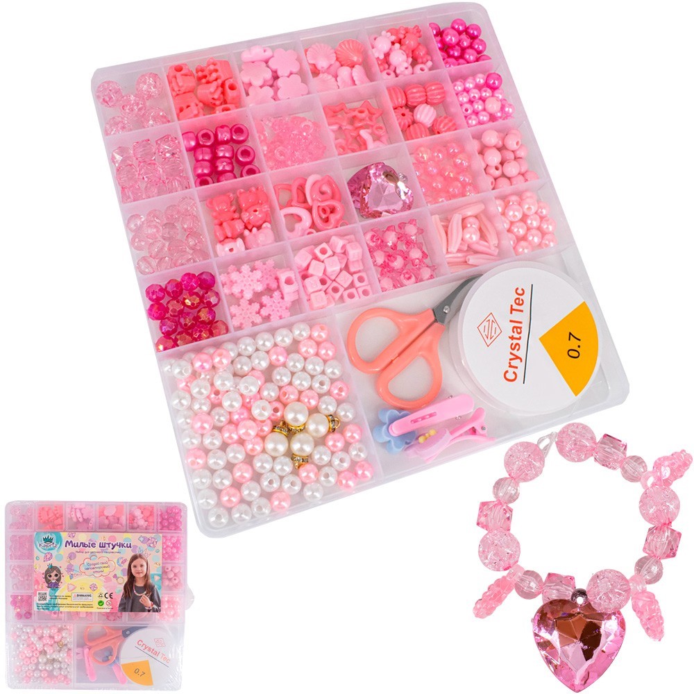 Комплектация: бусины разных форм и цветов (25 видов), мини-ножницы – 1 шт., моток лески (0,7 м) ¬– 1 шт., заколки – 2 шт. удобный пластиковый бокс для хранения – 1 шт.