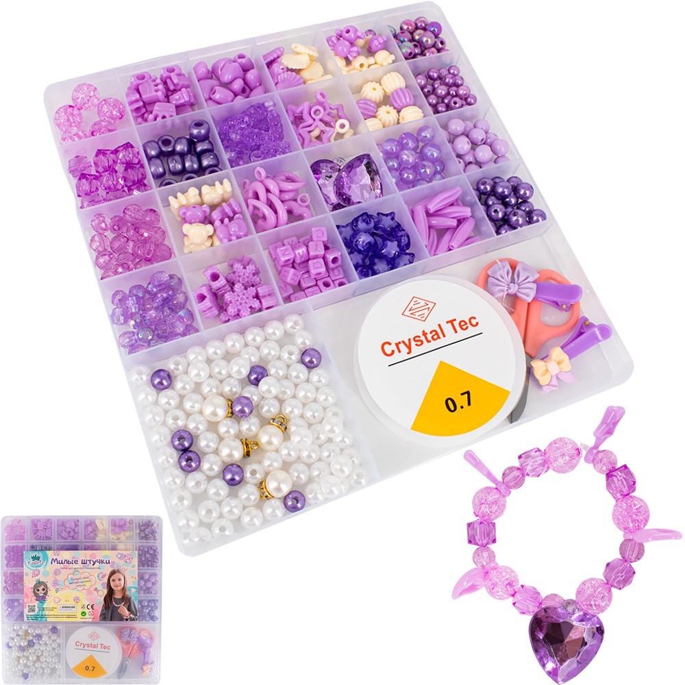Комплектация: бусины разных форм и цветов (25 видов), мини-ножницы – 1 шт., моток лески (0,7 м) ¬– 1 шт., заколки – 2 шт. удобный пластиковый бокс для хранения – 1 шт.