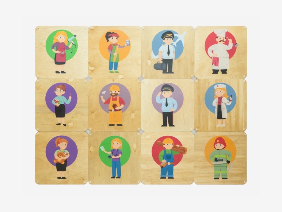 Доборные панели «Профессии» для комбинации с дидактическими настенными панелями «АЛМА». Являются эстетическим дополнением интерьера, и одновременно инструментом для развития детей, обогащая их знания о мире профессий.