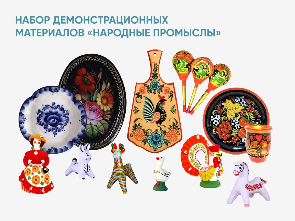 Набор знакомит детей с богатым культурным наследием народных художественных промыслов России. В него входят изделия ручной работы, выполненные в традиционных техниках росписи и лепки. Эти предметы помогут изучить стилистику и отличительные черты каждого промысла и послужат ярким наглядным материалом для занятий по ИЗО.