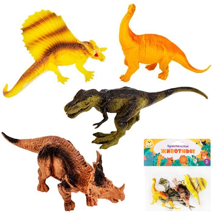 Комплектация: тираннозавр (18 х 12 х 6 см) – 1 шт., диплодок (15 х 10,5 х 4 см) – 1 шт., трицератопс (15 х 7 х 5 см) – 1 шт., диметродон (17 х 8 х 7 см) – 1 шт.
