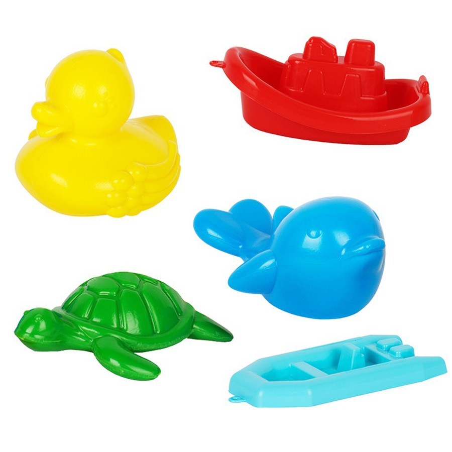 • В наборе фигурки дельфина, черепахи, уточка, кораблика и лодочки.