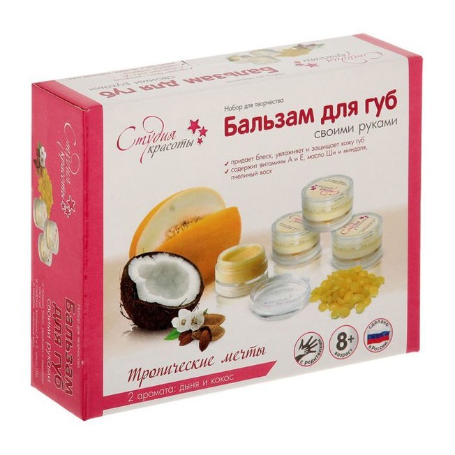 Благодаря набору "Бальзам для губ своими руками. Тропические мечты" девочки смогут самостоятельно изготовить бальзам для губ. В комплект входят все необходимые компоненты и подробная инструкция. В наборах "Студия красоты" используются только гипоаллергенные компоненты российских производителей. Продукция прошла тестирование и признана абсолютно безопасной для детей. Бальзам придает блеск, увлажняет и защищает кожу губ, содержит витамины А и Е, масло Ши и миндаля, пчелиный воск. Девочкам понравится самостоятельно готовить косметическое средств