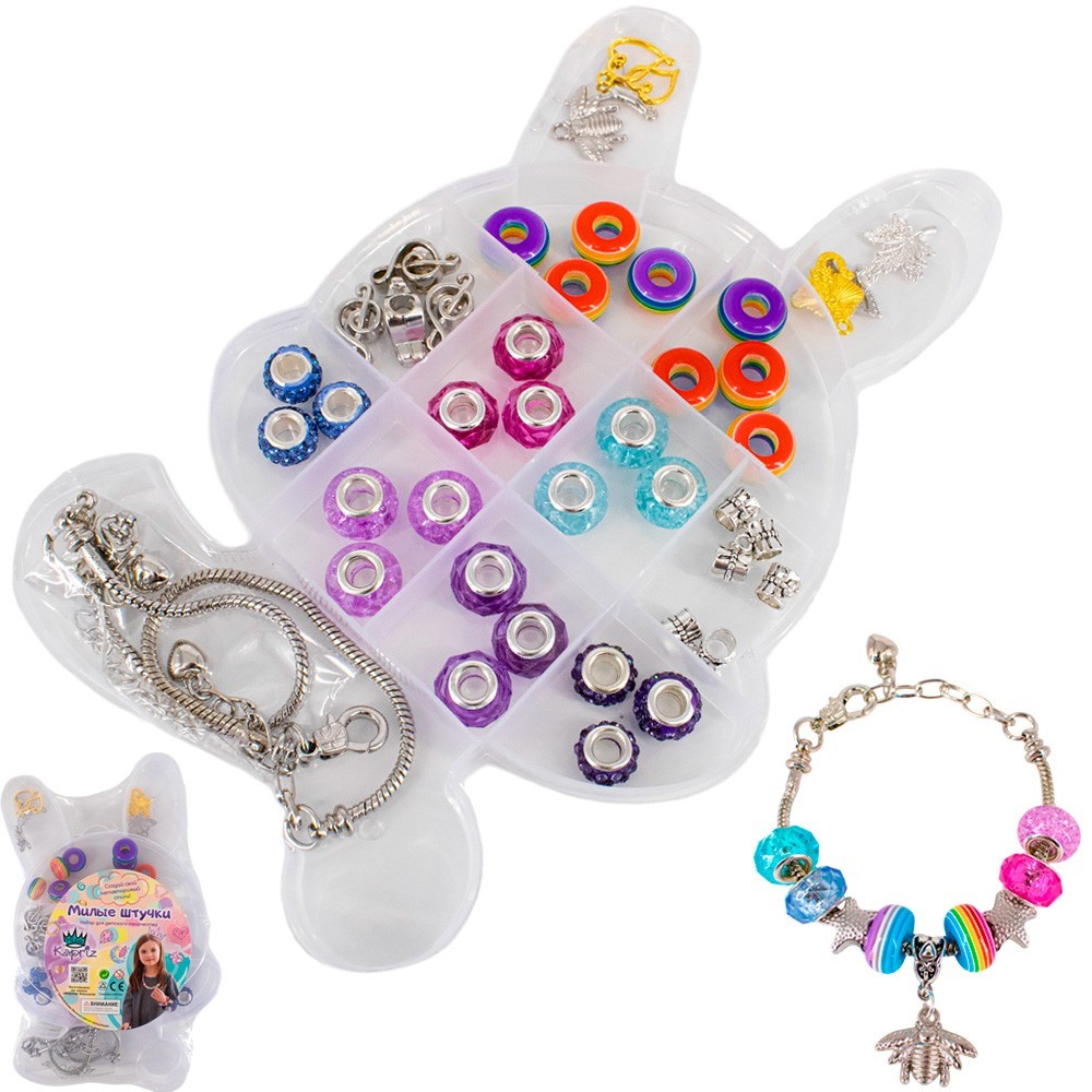 Комплектация: бусины в виде шаров (10 видов), основа для браслета, подвеска (2 вида), пакетик застежек-креплений