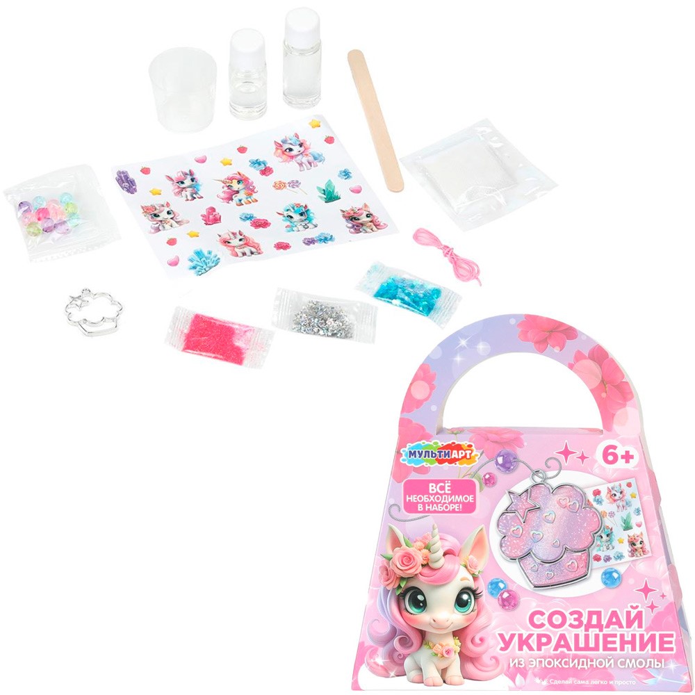 Набор для творчества Для создания украшений из эпоксидной смолы сумочка, пирожное, единорог MultiArt в кор.90шт EPOXBAG-128723-UNIC