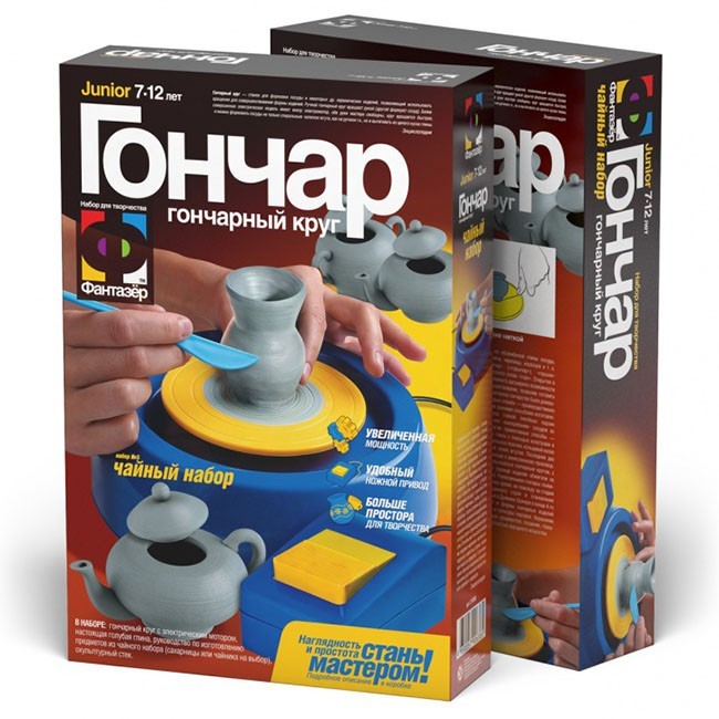 Набор для создания изделий из глины познакомит ребенка с процессом лепки при помощи гончарного круга и станет замечательным подарком. Для гармоничного развития ребенка важно заниматься творчеством, ведь оно не только формирует художественный вкус, но также и развивает творческие способности, внимание, воображение, мелкую моторику, цветовосприятие и усидчивость. Глина - замечательный материал для творчества, позволяющий реализовать самые смелые творческие замыслы. Это пластичный, послушный и приятный на ощупь материал. Из него ребенок сможет вылепить множество фигурок. Готовую поделку следует высушить, а затем можно расписать красками или покрыть глазурью. Гончарный круг оснащен моторчиком для вращения.