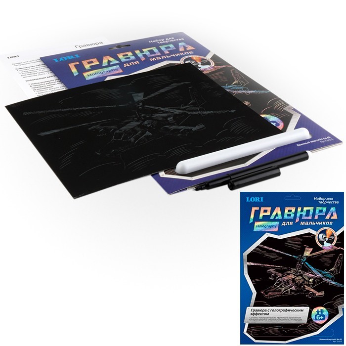 Гравюра - особый вид графического искусства. Сцарапывая верхний слой гравюры специальным штихелем, входящим в набор, ребёнок может самостоятельно создать настоящее произведение искусства и почувствовать себя гравером. Готовую гравюру можно вставить в рамку. Набор по созданию оригинальной гравюры с изображением вертолета Ка-52 от российского производителя "Lori" понравится маленьким художникам, ведь они смогут создать самостоятельно замечательный подарок родным и друзьям. Гравюра требует усидчивости, внимания и терпения, ведь это кропотливый труд. Набор содержит все необходимое для создания оригинального панно. Он поможет развить мелкую моторику, внимание к мелочам, аккуратность и подарит множество приятных минут.