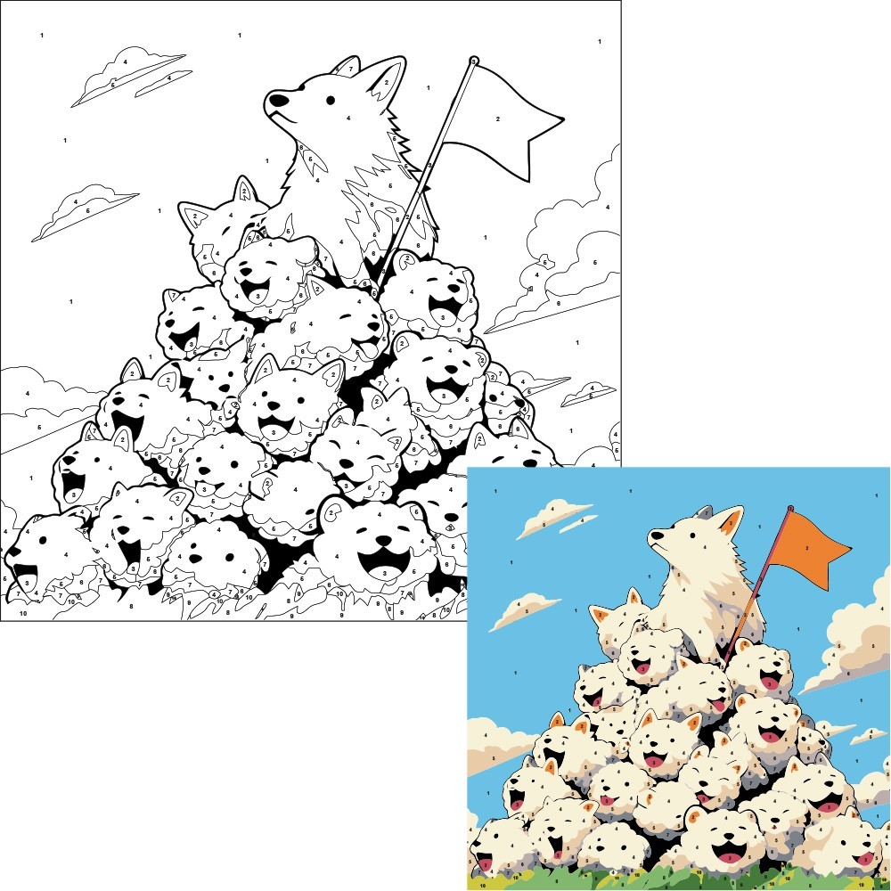 В набор входит холст для раскрашивания, на которую нанесена нумерованная схема рисунка, набор акриловых красок и кисть.