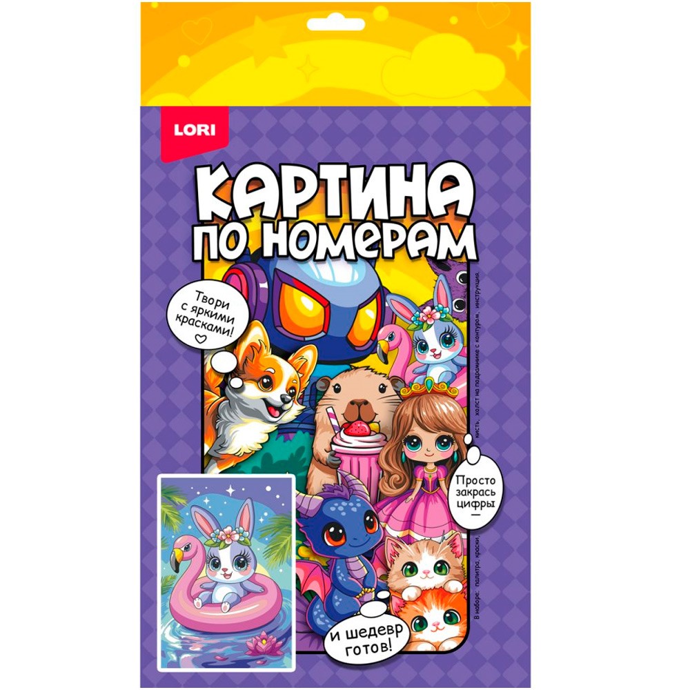 Комплектация: холст на деревянном подрамнике с контуром, краски - 9 цв. со смешиванием, палитра, кисть, инструкция