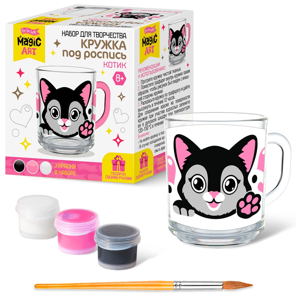 Комплектация: кружка, кисть, набор акриловых красок - 3 цв., рисунок-трафарет, контур черного цвета
