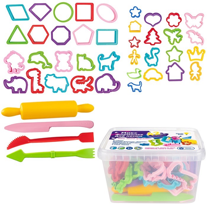 В наборе: большие формочки «Зверята», «Предметы» и «Фигуры», мини-формочки, 3 стека, скалка
