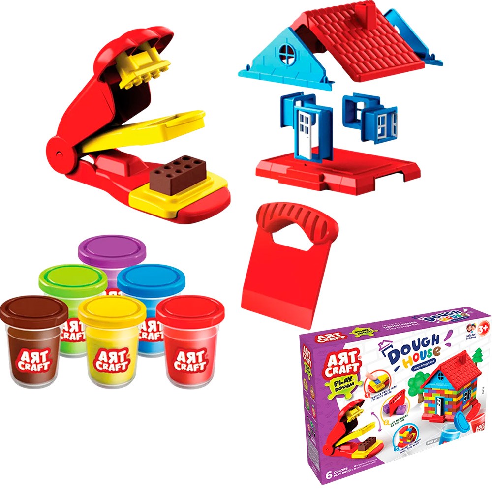 Комплектация: тесто - 6 цв. по 56 г, детали дома, станок для кирпичей - 1 шт., скребок - 1 шт.