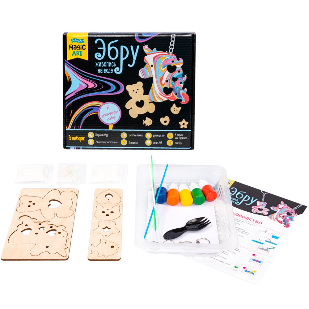 Комплектация: пластиковый лоток, гребень-вилка, шпажки для рисования - 3 шт.,- листы бумаги для переноса рисунка формата А6 – 10 шт., порошок-загуститель - 2 уп. (по 5 г), краски – 5 шт. (по 7 мл.), пакетик с глиттером - 1шт., заготовки для брелоков - 6 шт., кольцо для брелоков с цепочкой - 4 шт., кольцо для брелоков без цепочки - 4 шт., инструкция