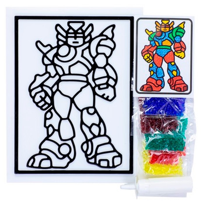 В набор входит картинка с контуром рисунка и углублениями, в которые нужно налить клей и распределить цветные бусины, чтобы раскрасить изображение.