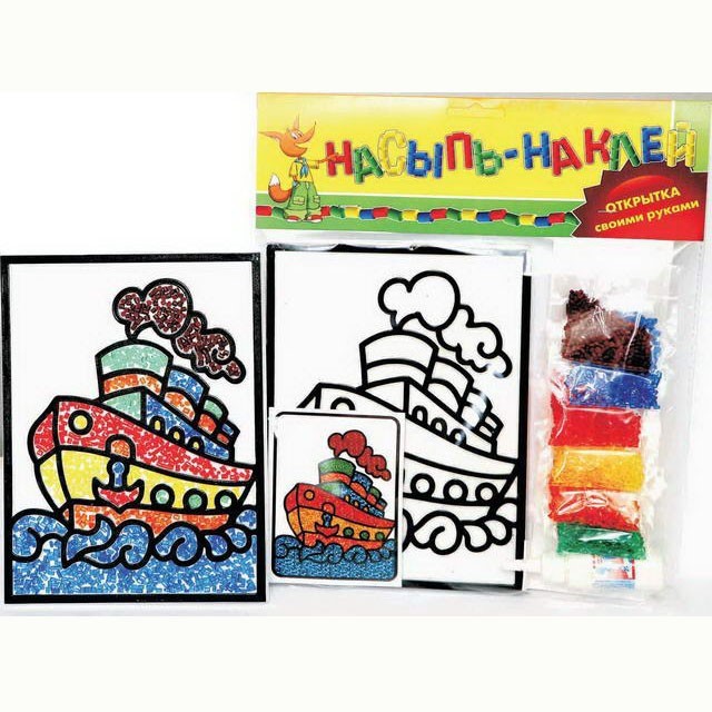 Ребенок с помощью клея и цветных гранул может создать веселую открытку по имеющимся шаблонам, а потом с гордостью показать или подарить ее своим близким.