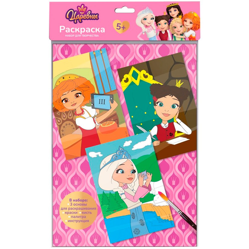 Комплектация: 3 основы с нанесённым контуром, краски, кисть, палитра, инструкция.