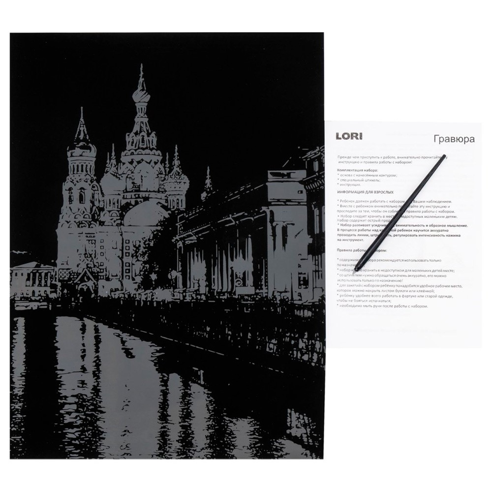 Комплектация: основа с нанесенным контуром рисунка, специальный штихель, инструкция